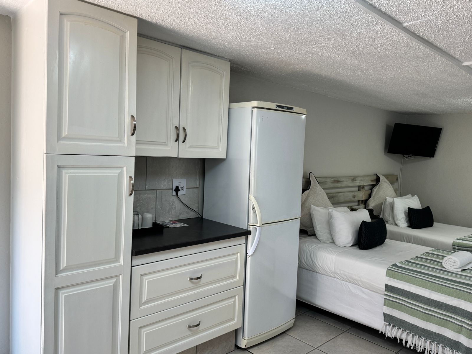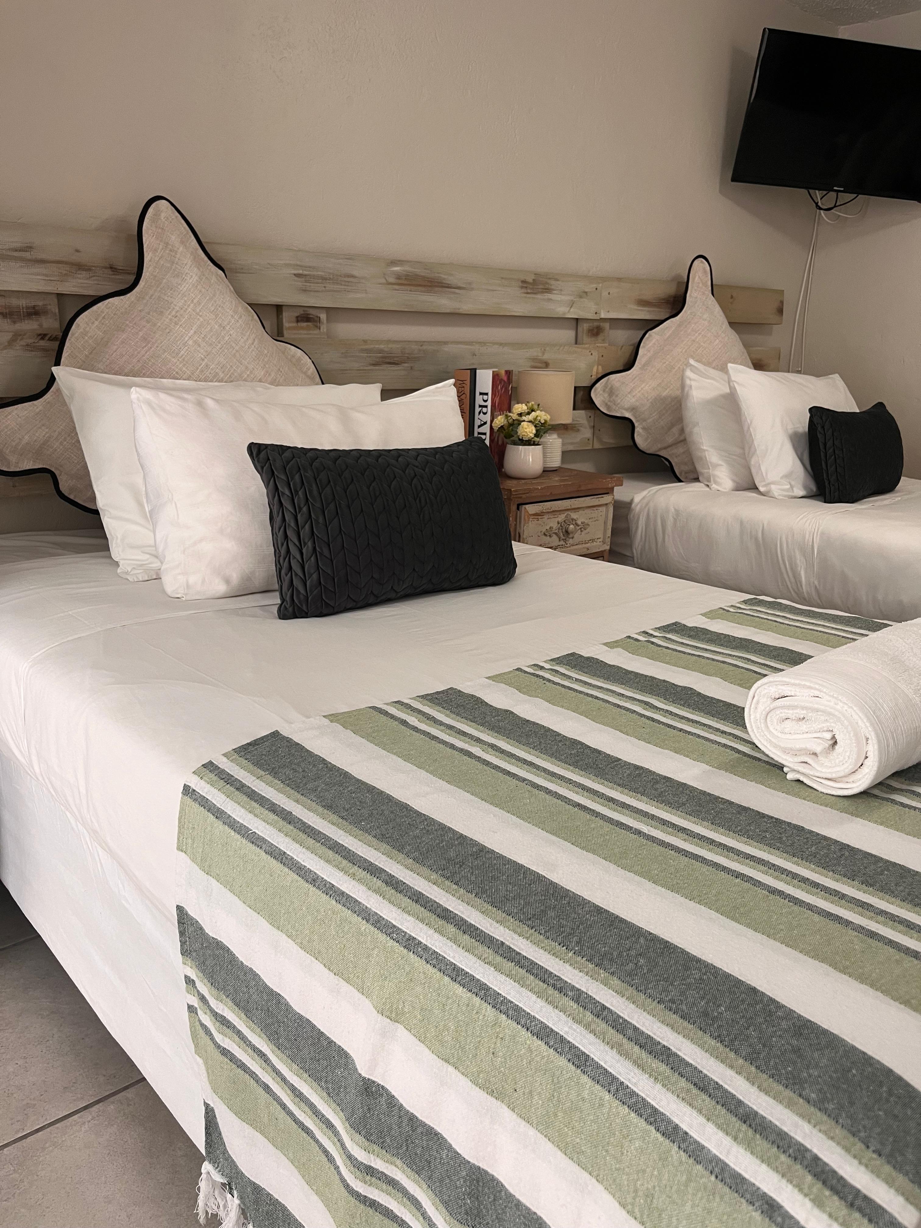 The family room accommodates 4 people and has a super King-size bed, a ¾ bed and a sleeper couch for a child under 12 years of age. The en-suite bathroom has a shower, wash basin and toilet. The room has a fully equipped kitchen with a refrigerator, microwave, stove, kettle, toaster and cutlery and crockery.