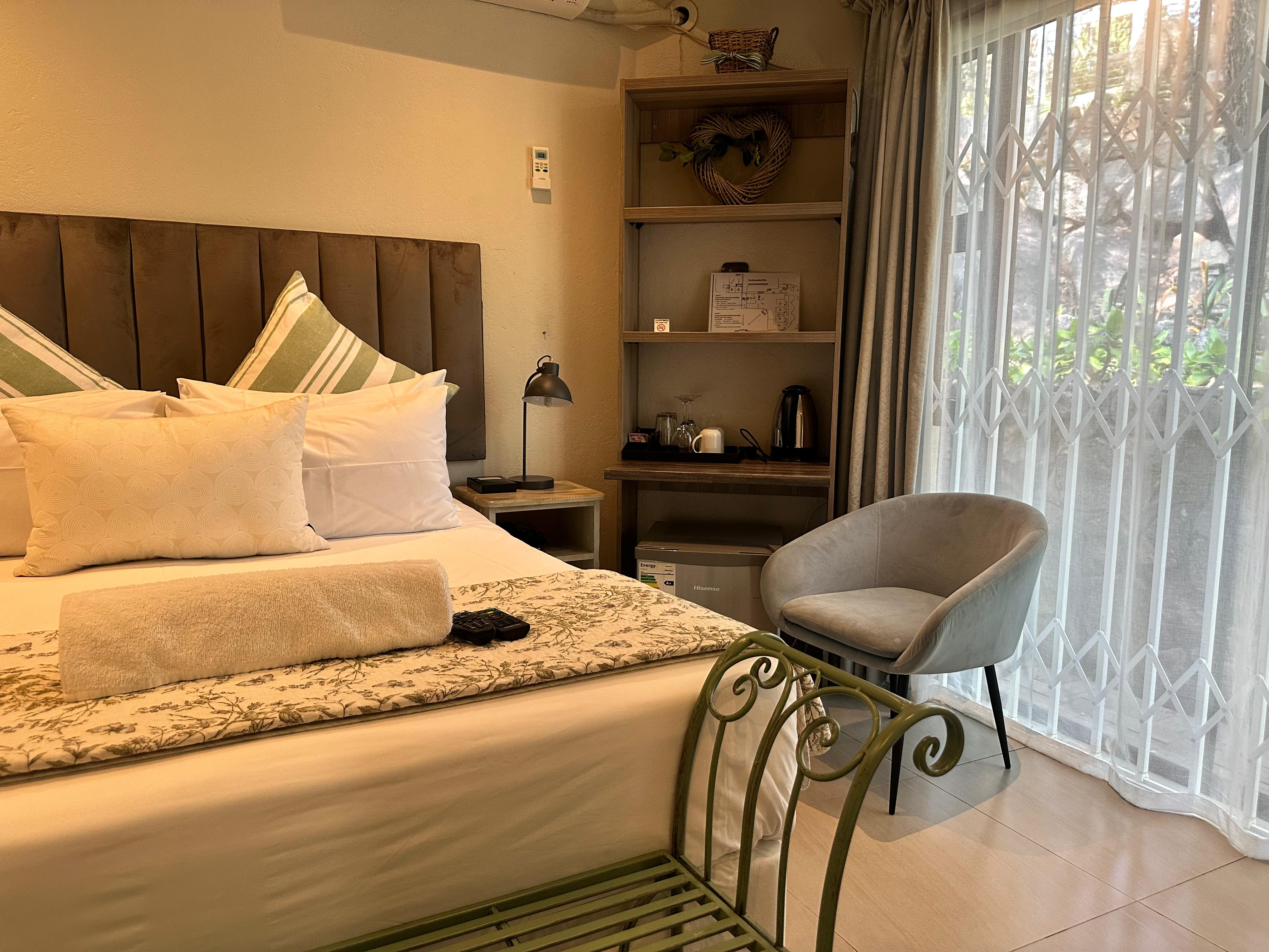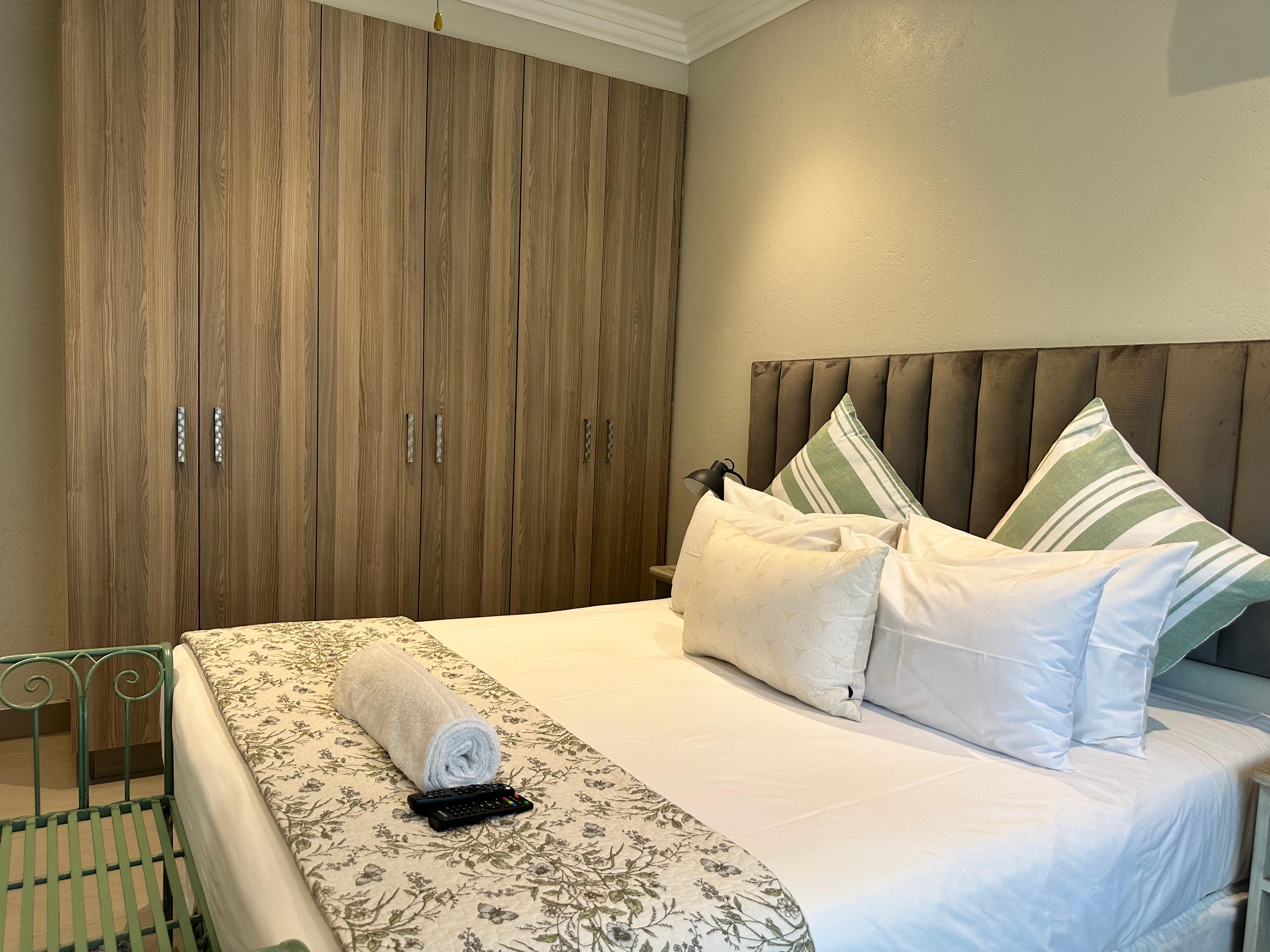 This bedroom has a Queen-size bed and an en-suite bathroom with a shower, wash basin and toilet.
